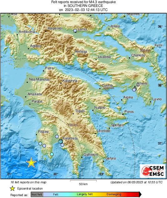 | Distance | 178 km S of Pátra, Greece / pop: 168,000 / local time: 14:44:13.2 2023-02-03 34 km SSW of Pýlos, Greece / pop: 2,300 / local time: 14:44:13.2 2023-02-03 |