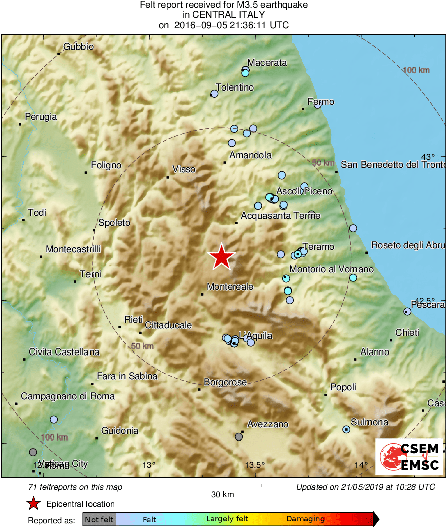 | Distance | 74 km W of Pescara, Italy / pop: 116,000 / local time: 23:36:11.9 2016-09-05 4 km NE of Amatrice, Italy / pop: 1,000 / local time: 23:36:11.9 2016-09-05 |