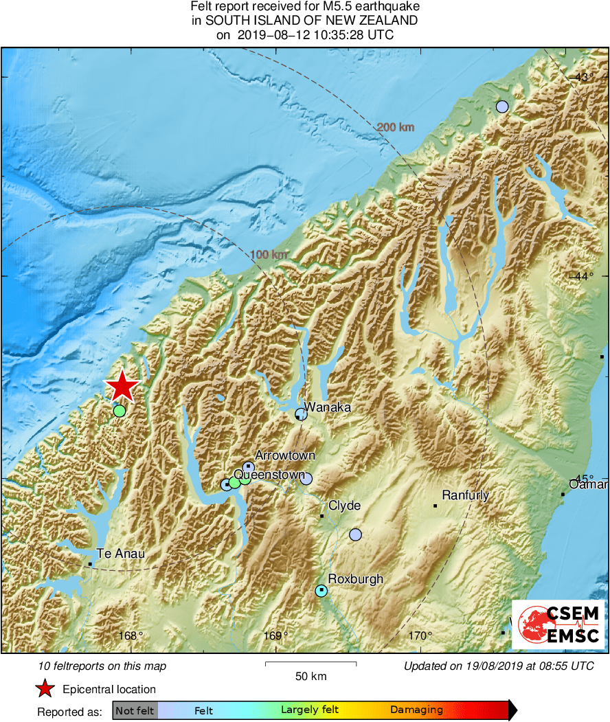 | Distance | 249 km WNW of Dunedin, New Zealand / pop: 114,000 / local time: 22:35:28.5 2019-08-12 78 km WNW of Queenstown, New Zealand / pop: 10,400 / local time: 22:35:28.5 2019-08-12 |