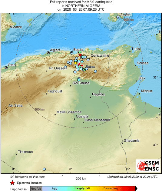 | Distance | 42 km SSE of El Eulma, Algeria / pop: 128,000 / local time: 08:09:26.8 2020-03-26 23 km WNW of Merouana, Algeria / pop: 47,600 / local time: 08:09:26.8 2020-03-26 |