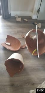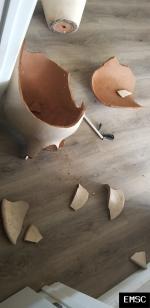 "Broken glass from items falling from shelves."