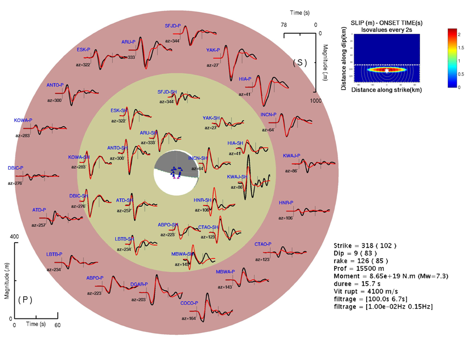 18 teleseismic good quality GSN broadband waveforms are retrieved from IRIS servers and processed with the patch method (Vallee et al. 2004). For frequencies lower than 6 seconds, one patch of slip is sufficient to ensure a good fit between data (in black) and synthetics (in red) for both P waves (outer red ring) and SH waves (inner yellow ring).