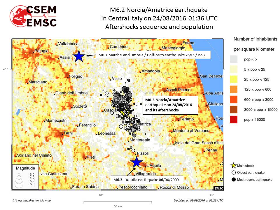 The main shock lies more or less between the epicenter of the April 6th, 2009 l'Aquila earthquake and of September 26th, 1997 Umbria and Marche earthquake. More information on the main shock is available here.
