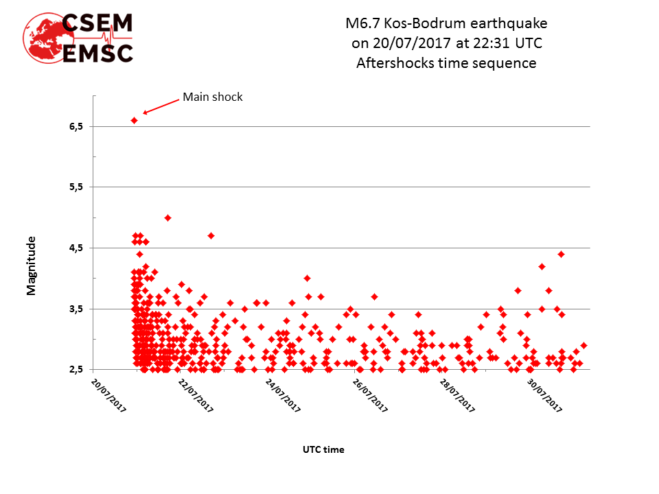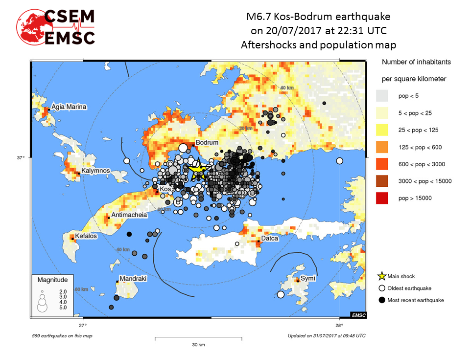 An earthquake of magnitude 6.6 hit Greek island of Kos, and Bodrum in Turkey (12 Km of epicenter) on Thursday 20 July 2017 at 22:31 UTC (01:31 local time). More information on the main shock is available here.